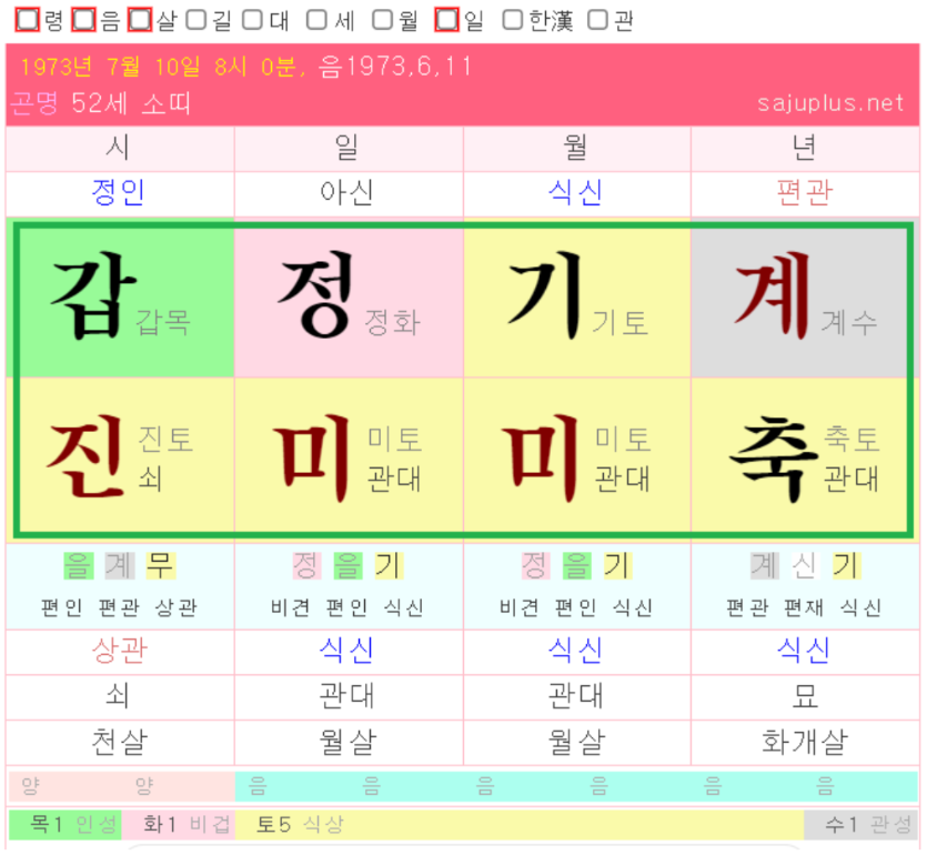 초록색으로 구분지어 놓은 네모칸 안에 8글자는 60갑자표 체계와 내 사주가 조합되어 결과가 나온 것입니다. 분홍색 상단에 보면 시, 일, 월, 년이라고 쓰여있는 것은 시주, 일주, 월주, 년주를 의미합니다.