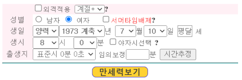 사이트에 접속하면 성별, 생일, 생시, 출생지 등을 입력합니다. 기입을 완료했다면 노란 [ 만세력보기 ] 버튼을 클릭합니다.
