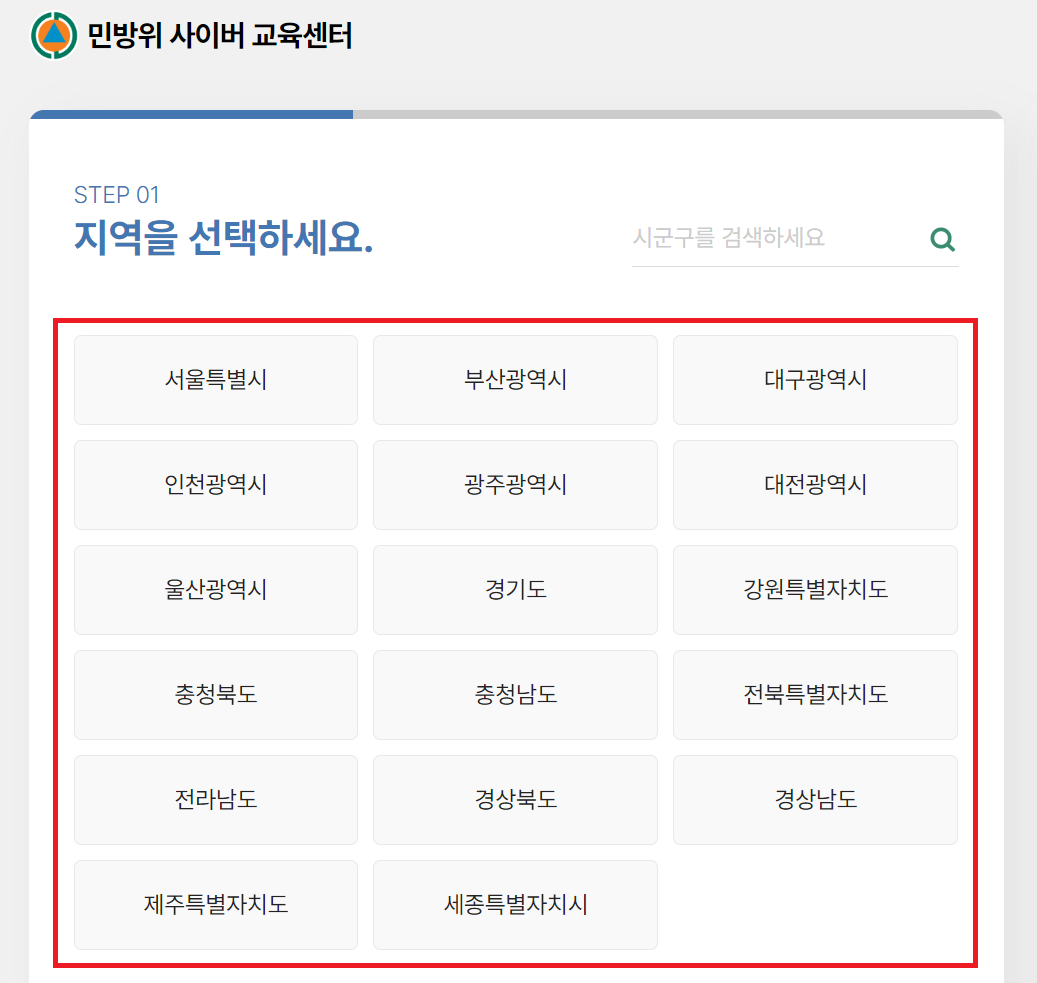 위의 버튼에서 사이버교육 홈페이지에 접속합니다. 본인 거주 지역을 선택하시고 로그인합니다. 홈페이지에서 교육 시작 버튼을 클릭하여 강의를 수강합니다.