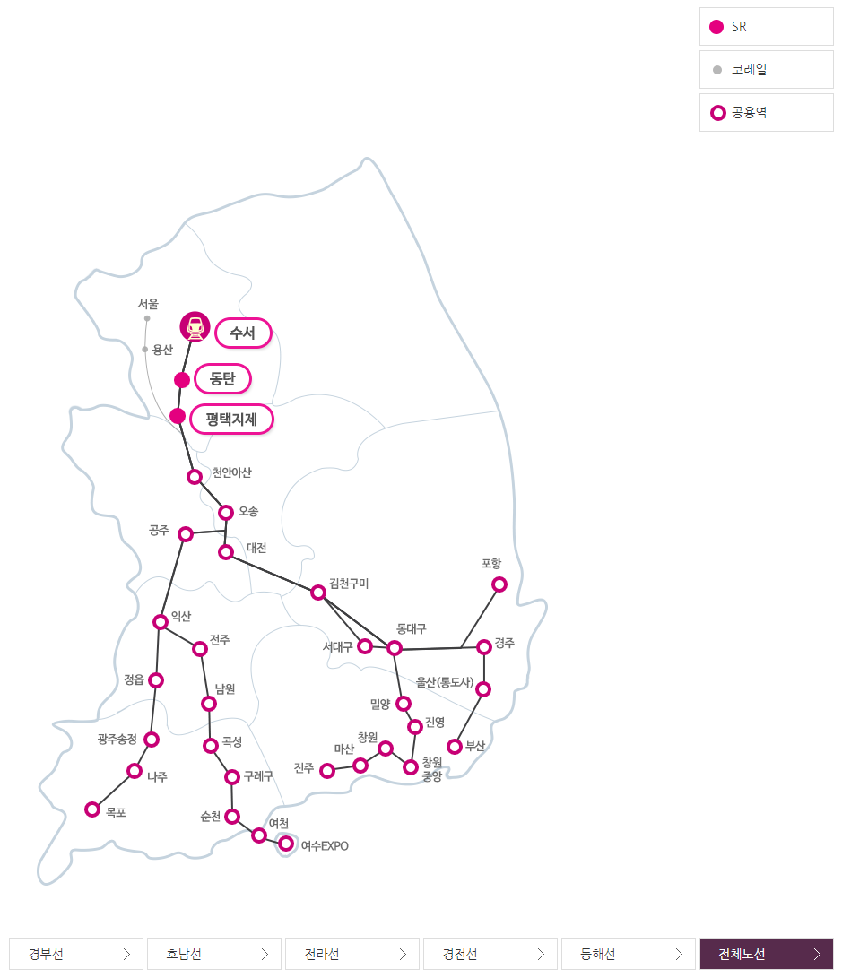 KTX와는 달리 SRT는 SR(주식회사)에 의해 운영되며, 수서역에서 출발하는 고속철도 노선으로서 수도권 남부와 충청, 영호남 지역을 연결합니다. 2016년 개통이후, 수서역은 서울 남부 지역의 교통 허브 역할을 하고 있습니다.