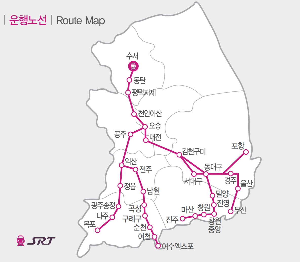 서울의 강남권에 위치한 수서역을 기점으로 운행되는 고속철도 서비스를 SRT라 합니다. SRT는 고속철도 중에서도 빠른 이동을 제공하는 특급열차로, 주요 목적지는 동탄, 부산, 목포 등을 포함합니다.