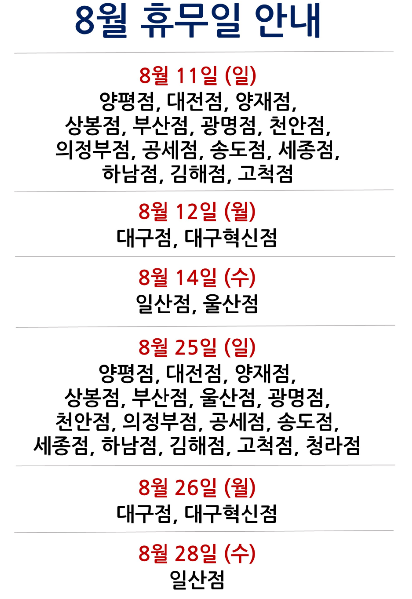 양평점, 대전점, 양재점, 상봉점, 부산점, 울산점, 광명점, 천안점, 의정부점, 공세점, 송도점, 세종점, 하남점, 김해점, 고척점, 청라점 - 8월 26일 월요일 휴무일