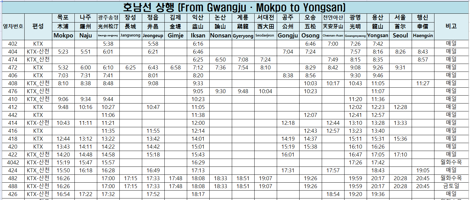 호남선 상행KTX열차시간표입니다. 자세한 내용은 위에 올려드린 버튼 또는 엑셀파일을 확인하세요.
