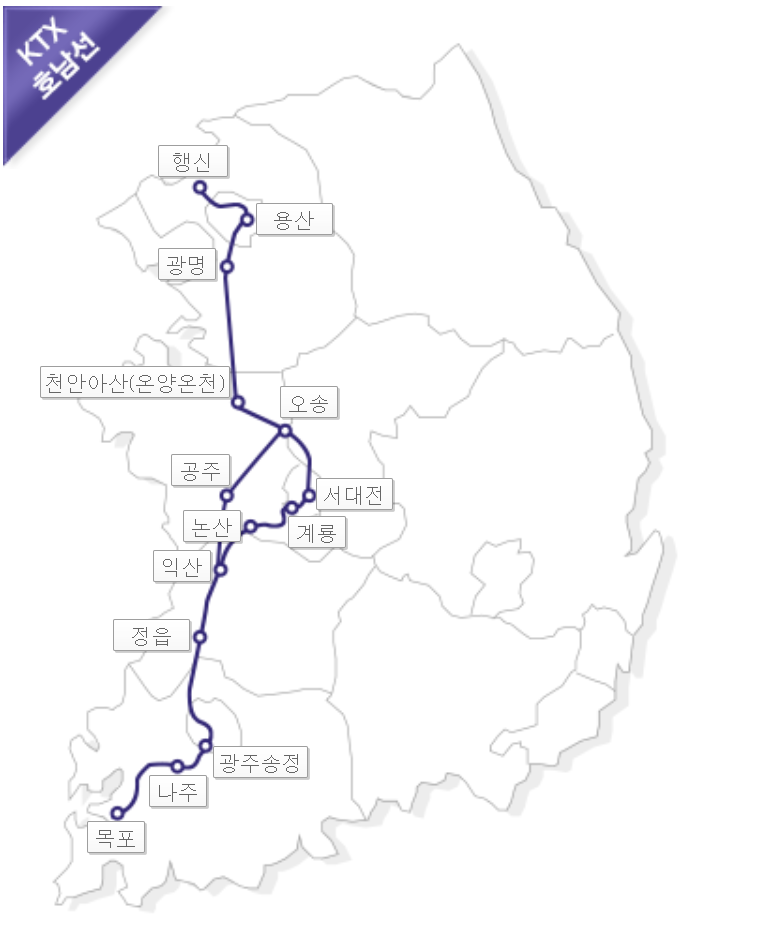 - 행신역-용산역-광명역-천안아산(온양온천)역-오송역-공주역-익산역-정읍역-광주송정역-나주역-목포역