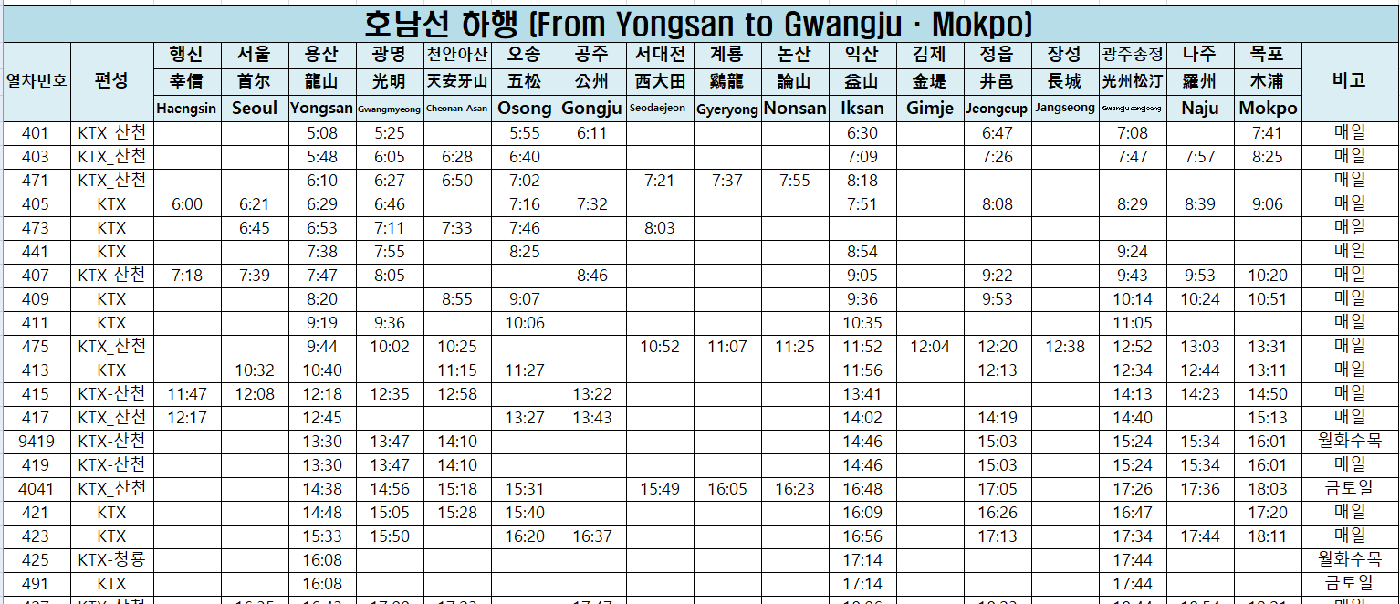 호남선 하행KTX열차시간표입니다. 자세한 내용은 위에 올려드린 버튼 또는 엑셀파일을 확인하세요.